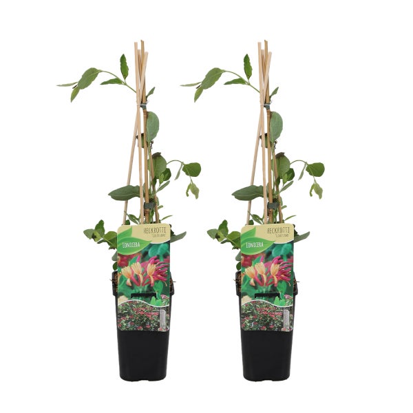 Bloomique - 2er-Set - Lonicera Heckrottii Goldflame - Geißblatt - Rot, Gelb - Kletterpflanzen - Gartenpflanzen - Winterhart - Topf 15 cm - 70-80 cm hoch