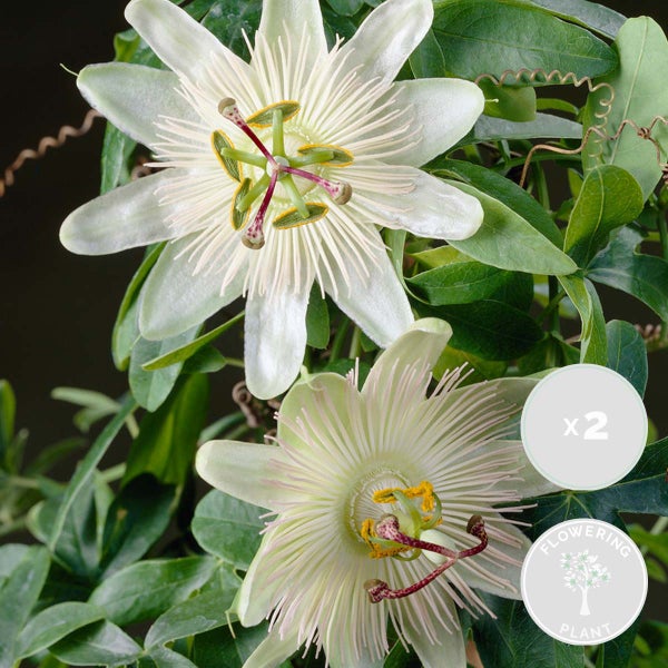 Bloomique - 2er-Set - Passiflora Constance Elliot - Passionsblume - Weiß - Kletterpflanzen - Gartenpflanzen - Winterhart - 50-70 cm Hoch - Topf 15 cm
