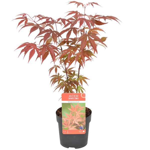 Der Acer palmatum 'Atropurpureum', besser bekannt als Japanischer Ahorn, ist ein langam wachsender, robuster Strauch mit schönen roten Blättern. Im Winterhut Acer palmatum 'Atropurpureum' keine Blätter. Sie wird im Frühjahr blühen. Im Sommer wird es richtig strahlen! All diese Eigenschaften machen Acer palmatum 'Atropurpureum' zu einer schönen, aber auch praktischen Outdoor-Pflanze, an der Sie das ganze Jahr über Freude gehabt haben.