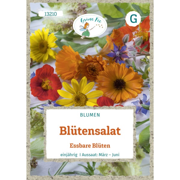 Dekorative Mischung einjähriger Blumen und Kräuter mit essbaren Blüten wie Ringelblumen, Kapuzinerkresse, Studentenblumen u.a., als Beigabe zu Salaten und zur Dekoration von Gerichten oder Süßspeisen. Für eine kontinuierliche Ernte die Blüten häufig pflücken, um den Samenansatz zu verhindern und die Neubildung von Blüten anzuregen.
