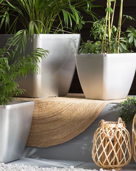 Silberner Blumenkübel mit glänzendem Finish. Ob für Blumen im Garten oder Pflanzen im Wohnzimmer - dieser Blumenkübel kann je nach Bedarf im Innen- sowie im Außenbereich eingesetzt werden. Setzen Sie mit seiner silbernen Farbe in glänzender Optik einen eleganten und zugleich dekorativen Akzent - für ein schönes Zuhause mit modernem Stil. Details: Typ Outdoor Blumentopf. Farbe: Silber. Material: Stein. Material: Lehm-Faser-Mischung. Form: Quadratisch. Abflusslöcher am Boden: Vorgestanzt. Innentopf benötigt: Nein. Volumen: 28. Abmessungen: Tiefe: 35 cm. Breite: 35 cm. Höhe: 34 cm. Gewicht: 2 kg. .Sie kaufen: 1 x Blumenkübel. Produktvorteile: Mit optionalen Abflusslöchern (inkl. Stöpsel), Modernes Design, Hochwertiges Material, Beständig gegen niedrige und hohe Temperaturen, Geeignet für den Innen- und Aussenbereich, UV-Beständigkeit. Montage: Benötigt keine Montage. Beständigkeit: Feuchtigkeitsbeständig, Temperaturbeständig, UV-beständig. Beständigkeit Text: UV-strahlenbeständige Möbel weisen eine erhöhte Beständigkeit gegen Verblassen oder Verfärbung auf. Wir empfehlen jedoch, dass Sie das Produkt bei Nichtgebrauch abgedeckt aufbewahren. Dies gewährleistet die maximale Lebensdauer der Möbel. Feuchtigkeitsbeständigkeit bedeutet, dass der Artikel leichtem Regenschauer und hoher Luftfeuchtigkeit im Außenbereich standhält. Sollte es nicht möglich sein, ihn drinnen zu lagern, sollte er mit einem Regenschutz abgedeckt werden. Wenn Möbel oder Accessoires längere Zeit Feuchtigkeit ausgesetzt werden, kann dies zu anhaltenden Schäden führen. Das Produkt ist temperaturbeständig, so dass es an heißen Tagen und außerhalb der Saison im Freien verwendet werden kann. Der Artikel hält Temperaturen von -20° bis 40° Celsius stand. Pflegeanleitung: Lehm-Faser-Mischung: 1.Das Material ist für die Nutzung im Innen- und Außenbereich konzipiert und bedarf keiner besonderen Pflege oder Reinigung. Jedoch empfehlen wir für die Wintersaison, die Produkte trocken und kühl drinnen zu lagern.