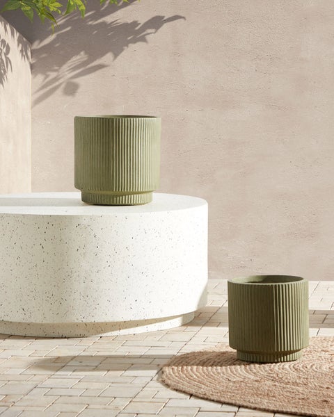 Runder, olivgrüner Blumenkübel mit angesagter Rillen-Struktur. Verschönern Sie Ihren In- und Outdoorbereich mit diesem Pflanztopf – ein Modell, das in Perfektion aufblüht. Er besteht aus einer hochwertigen Mischung aus Glasfaser und Ton, so ist der Kübel sowohl langlebig als auch strapazierfähig. Sein schlankes Design mit den vertikalen Rillen verleihen ihm einen eleganten Touch, während seine UV-, wasser-, wetter- und fleckenbeständigen Eigenschaften für eine anhaltende Schönheit sorgen. Dieser vielseitige Topf ist mit einem Abflussloch ausgestattet, um die Gesundheit Ihrer Pflanzen zu gewährleisten, und eignet sich perfekt für Gärten, Terrassen und Balkone. Details: Typ Outdoor Blumentopf. Farbe: Grün. Farbton: Olivgrün. Material: Keramik. Material: Lehm-Faser-Mischung. Form: Rund. Abflusslöcher am Boden: Ja. Innentopf benötigt: Nein. Volumen: 16.5. Abmessungen: Tiefe: 30 cm. Breite: 30 cm. Höhe: 30 cm. Gewicht: 5 kg. .Sie kaufen: 1 x Blumenkübel. Produktvorteile: Die integrierte Öffnung sorgt für schnellen Wasserabfluss, Ganzjähriger Schutz vor Sonne, Regen und Staub, Modernes Design, Beständig gegen niedrige und hohe Temperaturen, UV-Beständigkeit. Montage: Benötigt keine Montage. Zusatzinformationen: Bitte beachten Sie, dass jedes Modell leicht von dem im Bild dargestellten abweichen kann. Die Anordnung der Farben und Muster kann unterschiedlich ausfallen und wird nicht als Produktfehler, sondern als Merkmal betrachtet Beständigkeit: Temperaturbeständig, UV-beständig, Schmutzbeständig, Feuchtigkeitsbeständig. Beständigkeit Text: Feuchtigkeitsbeständigkeit bedeutet, dass der Artikel leichtem Regenschauer und hoher Luftfeuchtigkeit im Außenbereich standhält. Sollte es nicht möglich sein, ihn drinnen zu lagern, sollte er mit einem Regenschutz abgedeckt werden. Wenn Möbel oder Accessoires längere Zeit Feuchtigkeit ausgesetzt werden, kann dies zu anhaltenden Schäden führen. UV-strahlenbeständige Möbel weisen eine erhöhte Beständigkeit gegen Verblassen oder Verfärbung auf. Wir empfehlen jedoch, dass Sie das Produkt bei Nichtgebrauch abgedeckt aufbewahren. Dies gewährleistet die maximale Lebensdauer der Möbel. Das Produkt wurde aus Materialien gefertigt, die eine hohe Fleckenbeständigkeit aufweisen, weshalb es zu keinen Verfärbungen kommen sollte oder diese leicht zu beseitigen sind. Bei der Fleckenentfernung sind die Pflegehinweise zu berücksichtigen. Das Produkt ist temperaturbeständig, so dass es an heißen Tagen und außerhalb der Saison im Freien verwendet werden kann. Der Artikel hält Temperaturen von -20° bis 40° Celsius stand. Pflegeanleitung: Lehm-Faser-Mischung: 1.Das Material ist für die Nutzung im Innen- und Außenbereich konzipiert und bedarf keiner besonderen Pflege oder Reinigung. Jedoch empfehlen wir für die Wintersaison, die Produkte trocken und kühl drinnen zu lagern.