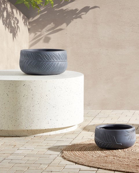 Moderner, runder Blumenkübel mit Palmenmuster für den Innen- und Außenbereich. Dieser Übertopf bietet Ihnen einen zeitlosen Charme, Langlebigkeit und einen naturnahen Look. Dieser Topf besteht aus einer robusten Mischung aus Ton und Glasfasern, die dem Modell sowohl Eleganz als auch Haltbarkeit verliehen. Er ist mit einem naturnahen Muster versehen und in einer stilvollen Anik-Optik gehalten, so erzählt jeder der Kübel eine Geschichte von organischer Schönheit. Dank des Lochs im Boden des Blumenkübels kann sich kein Gießwasser im Inneren ansammeln, so sind die Wurzeln Ihrer Pflanzen stets geschützt. Exponieren Sie Ihre ausgesuchten Pflanzen und verschönern Sie Ihren Indoor- oder Outdoorbereich mit diesem bezaubernden Pflanzgefäß. Details: Typ Outdoor Blumentopf. Farbe: Grau. Material: Keramik. Material: Lehm-Faser-Mischung. Form: Rund. Abflusslöcher am Boden: Ja. Innentopf benötigt: Ja. Volumen: 12. Abmessungen: Tiefe: 35 cm. Breite: 35 cm. Höhe: 19 cm. Gewicht: 4 kg. .Sie kaufen: 1 x Blumenkübel. Produktvorteile: Mit Abflussloch, Modernes Design, Dekorativ und zugleich funktional, Hochwertiges Material, Beständig gegen niedrige und hohe Temperaturen, UV-Beständigkeit, Geeignet für den Innen- und Aussenbereich. Montage: Benötigt keine Montage. Zusatzinformationen: Im Boden des Blumenkübels befindet sich ein vorgefertigtes Loch. Bei Nutzung in Innenräumen sollte ein Untersetzer genutzt werden. Beständigkeit: UV-beständig, Wasserbeständig, Temperaturbeständig. Beständigkeit Text: UV-strahlenbeständige Möbel weisen eine erhöhte Beständigkeit gegen Verblassen oder Verfärbung auf. Wir empfehlen jedoch, dass Sie das Produkt bei Nichtgebrauch abgedeckt aufbewahren. Dies gewährleistet die maximale Lebensdauer der Möbel. Dieses Produkt zeichnet sich durch eine hohe Wasserbeständigkeit aus. Dies bedeutet, dass es in Kontakt mit Regen oder anderen Flüssigkeiten nicht beschädigt wird. Sie können das Produkt im Freien, auch bei Regen oder einer hohen Luftfeuchtigkeit nutzen. Außerhalb der Saison sollte das Produkt bedeckt und an einer abgedachten Stelle aufbewahrt werden. Das Produkt ist temperaturbeständig, so dass es an heißen Tagen und außerhalb der Saison im Freien verwendet werden kann. Der Artikel hält Temperaturen von -20° bis 40° Celsius stand. Pflegeanleitung: Lehm-Faser-Mischung: 1.Das Material ist für die Nutzung im Innen- und Außenbereich konzipiert und bedarf keiner besonderen Pflege oder Reinigung. Jedoch empfehlen wir für die Wintersaison, die Produkte trocken und kühl drinnen zu lagern.
