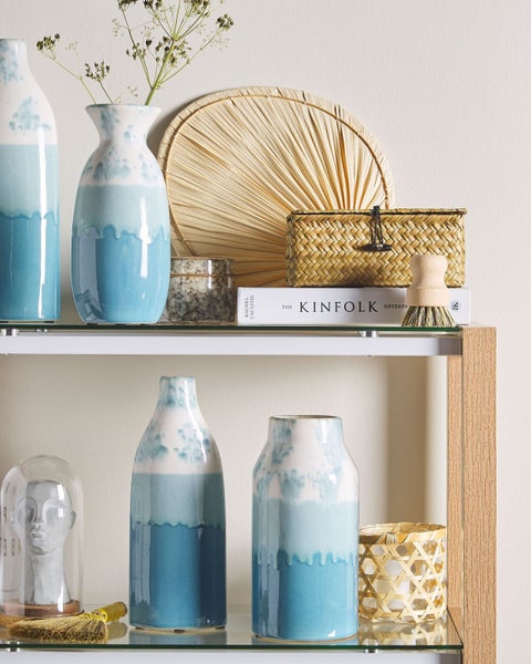 Moderne, handgefertigte Keramikvase mit Farbverlauf. Diese flaschenförmige Vase verleiht jeder Einrichtung eine interessante Note. Das wunderschöne Muster, das Wasser und den blauen Horizont darstellt, verleiht ihr einen ganz besonderen Zauber. Stellen Sie sie als alleinstehendes Dekoelement auf oder kombinieren Sie sie mit Blumen. Die Dekovase aus glasierter Keramik ist wasserdicht und hat eine Unterseite, um eventuellen Kratzern vorzubeugen. Details: Typ Blumenvase. Farbe: Blau. Material: Keramik. Material: Steinzeug. Handgefertigt: Ja. Abmessungen: Tiefe: 6 cm. Breite: 12 cm. Höhe: 30 cm. Gewicht: 1 kg. .Sie kaufen: 1 x Vase. Produktvorteile: Wunderbar geeignet für Schlaf- und Wohnbereich, Ein einzigartiger Hingucker, Handgefertigte Präzision, Präzise ausgearbeitete Details, Wasserdicht dank hochwertiger Materialien, Die Unterlage schützt vor Oberflächenkratzern. Montage: Benötigt keine Montage. Zusatzinformationen: Jeder Artikel ist ein handgefertigtes Unikat; Farbschattierung und Muster können daher vom Foto abweichen. Pflegeanleitung: Steinzeug: 1.Bitte ausschließlich milde Reinigungsmittel und weiche Tücher verwenden. Feuchte Stellen sofort trocken reiben.
