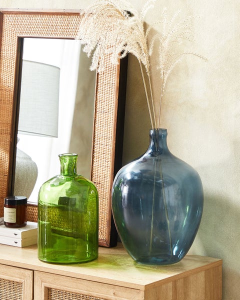 Wunderschöne runde Vase aus farbigem Glas. Diese schöne Tischvase ist die perfekte Ergänzung für jede Einrichtung. Handgefertigt aus haltbarem, halbtransparentem Glas, bringt sie einen sommerlichen Touch in jeden Wohnraum. Die Dekovase hat eine rustikale Form und ist mit ihrem schmalen Hals perfekt für künstliche oder frische Sträuße geeignet. Stellen Sie sie auf eine Konsole oder eine Kommode, um Ihr Zuhause zu dekorieren. Details: Typ Blumenvase. Farbe: Blau. Farbton: Dunkelblau. Material: Glas. Material: Glas. Handgefertigt: Ja. Abmessungen: Tiefe: 29 cm. Breite: 29 cm. Höhe: 39 cm. Gewicht: 3 kg. .Sie kaufen: 1 x Vase. Produktvorteile: Gut kombinierbar mit vielen Einrichtungsstilen, Perfekte Kombination aus Farben und Materialien, Hohe Qualität, Handgefertigte Präzision, Leichtes und zugleich strapazierfähiges Material, Besonders pflegeleicht. Montage: Benötigt keine Montage. Zusatzinformationen: Bitte beachten Sie, dass jedes Produkt handgefertigt ist. Deshalb kann der Farbton und die Größe leicht von dem Bild abweichen. Pflegeanleitung: Glas: Aufliegender Staub sollte sanft mit einem Staubwedel entfernt werden.