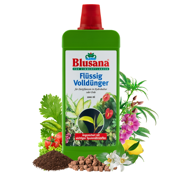 Blusana Universal Volldünger – Optimierte Pflanzennahrung für kräftiges WachstumMit dem Blusana mineralischen Volldünger versorgen Sie Ihre Pflanzen mit einer ausgewogenen Nährstoffkombination für optimales Wachstum. Die speziell entwickelte N-P-K plus Formel (6% Stickstoff, 3% Phosphor, 6% Kalium) unterstützt das gesunde Wachstum Ihrer Pflanzen, sei es in Hydrokultur, hydroponischen Systemen oder erdgebundenen Kulturen.Optimale Nährstoffversorgung dank SpurenelementenDieser Dünger ist angereichert mit essenziellen Spurenelementen wie Bor, Eisen, Mangan, Kupfer und Zink, die für die bestmögliche Nährstoffaufnahme sorgen. Er ist vielseitig einsetzbar, egal ob für erdlose Systeme, in Substraten oder klassischen Topfkulturen.Hohe Ergiebigkeit und einfache AnwendungDank der hohen Konzentration reicht eine 1-Liter-Flasche für ca. 600 Liter Gießwasser. Mit der praktischen Dosierhilfe ist die Anwendung kinderleicht und sorgt für eine präzise Nährstoffversorgung. Für alle Pflanzenarten und WachstumsphasenOb Zimmerpflanzen, Salat, Gemüse, Tomaten, Kräuter, Erdbeeren oder auch Cannabis – dieser Dünger fördert kräftiges Wachstum, eine üppige Blütenpracht und reiche Ernteerträge. Geeignet für alle Wachstumsphasen und Anbausysteme, egal ob mit oder ohne Granulat.Wichtige Produkteigenschaften: