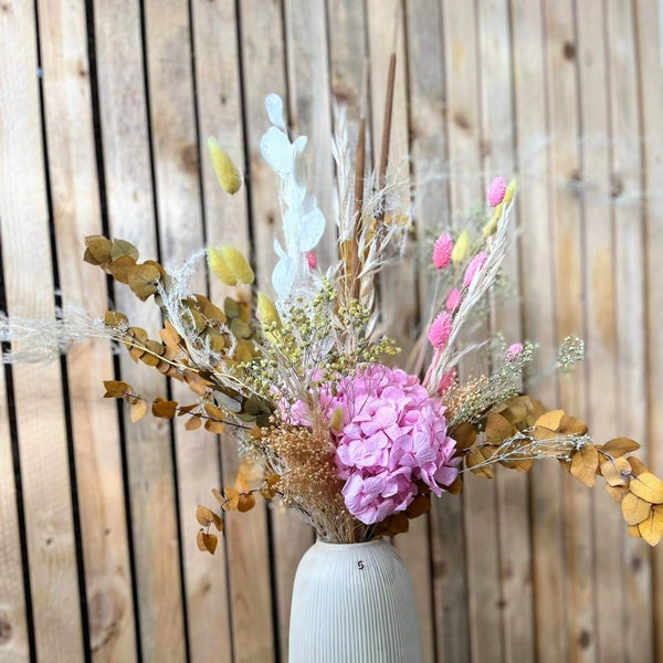 Blush Harmony: Trockenblumenstrauß mit Hortensien und Eukalyptus