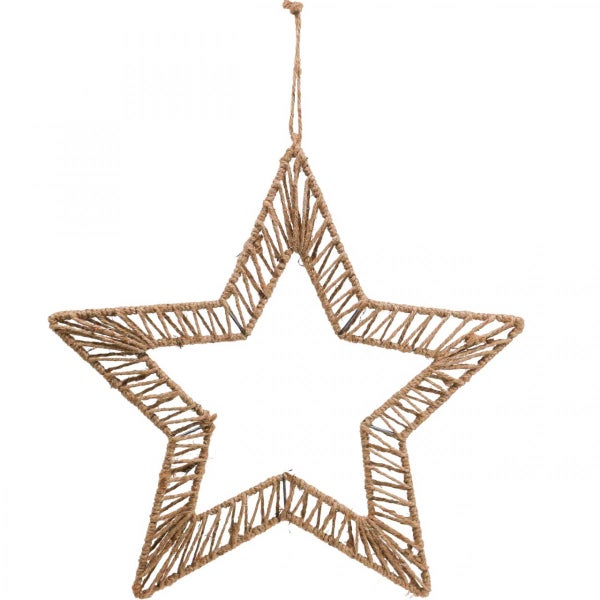 Bringen Sie Boho-Charme in Ihr Weihnachtsfest! Erleben Sie die festliche Magie mit unserem Boho Stern-Dekoring. Mit einem Durchmesser von 40 cm aus natürlicher Jutekordel wird dieser rustikale Schmuckstück zum Highlight Ihrer Adventszeit. Kreative Gestaltungsmöglichkeiten Fädeln Sie Lichterketten, Christbaumkugeln oder Bänder durch das Gewebe. Nutzen Sie den Ring als individuellen Türkranz, Fensterschmuck oder Wanddekoration. Der Fantasie sind keine Grenzen gesetzt! Einfache Handhabung Eine praktische Schlaufe ermöglicht schnelles Aufhängen. Dekorieren Sie den Stern pur oder ergänzen Sie ihn mit glitzernden Details. Passt perfekt zu jeder Weihnachtsdeko im angesagten Boho-Stil! Produktdetails: Gesamtlänge: ca. 48,5 cm Größe: ca. 38x40 cm Dicke: ca. 1 cm Farbe: Naturfarben, Silbern Material: Metall, Jutekordel Menge: 1 Stück Hinweis: Gezeigtes Zubehör ist nicht inbegriffen. Anb.Nr.: 06408 EAN: 4018865064088