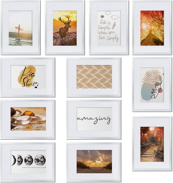 - Hinweisbomoe Bilderrahmen-Set für Collagen aus Kunststoff und Kunststoffglas Sie wollen eine Lösung um Ihre Wände stilvoll zu dekorieren, Ihre Fotos aufzuhängen oder Ihre gemalten Bilder immer in Sichtweite zu haben? Mit dem Bilderrahmen Set von bomoe haben Sie die perfekte Lösung gefunden. Verteilen Sie die Bilderrahmen Collage doch in verschiedenen Zimmern oder machen Sie eine große Collage daraus. Ob quer oder hochkant, mit den mitgelieferten Bildern oder eigenen, Sie können individuell entscheiden wie Sie dieses Fotorahmen Set am besten nutzen wollen. Zudem sind die Bilderrahmen mit Standfüßen ausgestattet, sodass sie ohne Probleme auch auf ihren Tischen oder Möbeln Platz nehmen können. Die bomoe Bilderrahmen Sets bestehen aus Kunststoff und beidseitig foliertem Kunststoffglas. Somit ist sichergestellt, dass Ihre Bilder, seien es Fotos, Kunstwerke oder selbst gemalte Bilder, langfristig vor Schmutz geschützt sind. Zu diesem Set gehören Passepartouts für alle Bilderrahmen. So können Sie auch kleinere Bilder in die Fotorahmen integrieren während sie den edlen Look behalten. Mit den Passepartouts kann man die folgenden Größen verändern: ohne PPT / mit PPT 13x18 cm / 9x13 cm