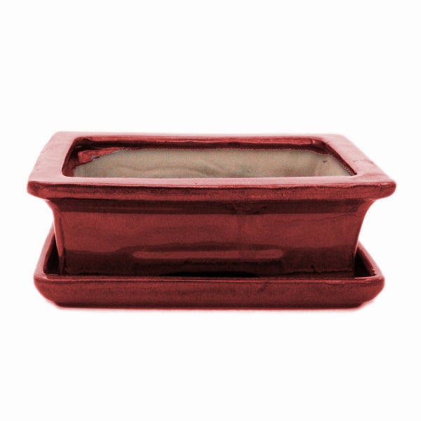 Glasierte Bonsai-Schale inklusive Untersetzer - rechteckig - rot