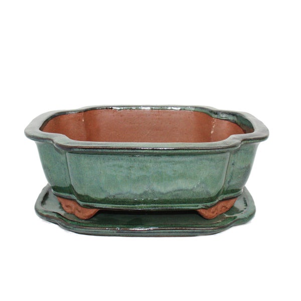 Glasierte Bonsai-Schale inklusive Untersetzer - Haitang-Form - grün