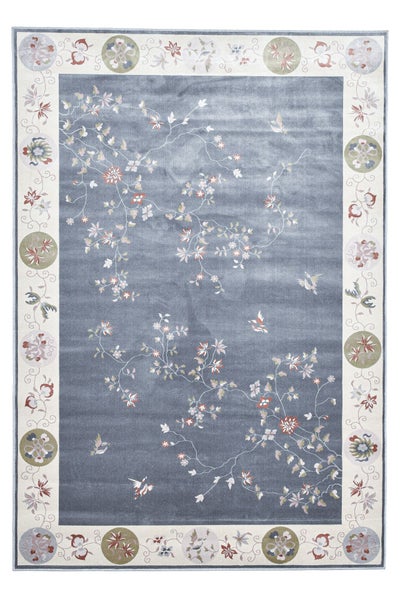 Die Blumenmuster im Hintergrund sind so zart gearbeitet, dass sie an altes chinesisches Porzellan aus der Qing-Dynastie erinnern und dem Teppich einen Hauch von Eleganz verleihen. Der farblich abgesetzte Rand des Musters wird durch kreisförmige Blumenvignetten akzentuiert und verleiht dem Teppich seinen stilvollen Rahmen.