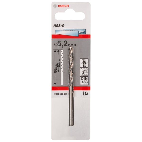 - Im Lieferumfang enthalten1x Bosch Metallbohrer HSS-G Standardline, DIN 338, 5,2 x 52 x 86 mm - 2608585924