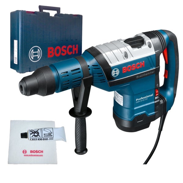 - Im Lieferumfang enthalten1x Bosch Bohrhammer GBH 8-45 DV 1x Fetttube 1x Maschinentuch 1x Zusatzhandgriff 1x Handwerkerkoffer
