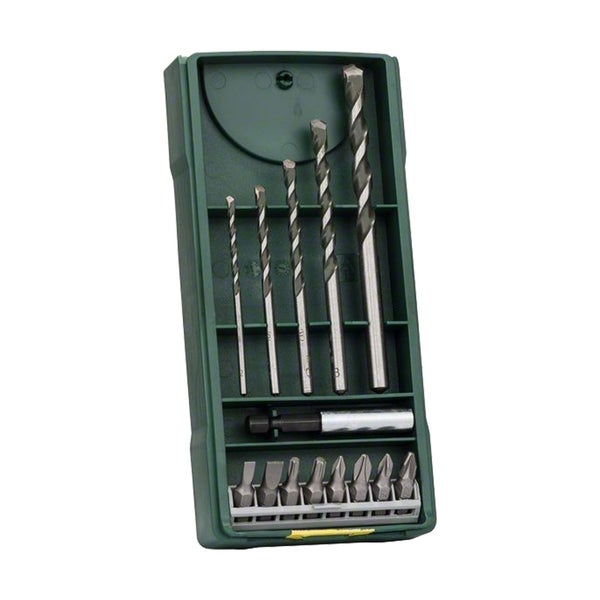 Auf vielseitige Aufgaben bestens vorbereitet: handliches, Universalbohrer-Set für Bohrungen in Fliesen, Holz, Stein, Beton und Metall. Inklusive 8 gängigen Schrauberbits und magnetischem Universalhalter. 5 robuste, langlebige Universalbohrer, Ø 3/4/5/6/8 mm, für präzise Bohrungen in Fliesen, Holz, Stein, Beton und Metall. Geeignet für alle genannten Materialien, sodass Bohrerwechsel entfallen. Mit schlagbohrfester Bohrspitze für hohe Lebensdauer. 8 Schrauberbits (Philips, Pozidriv, Torx, Längsschlitz) in den gängigsten Größen.12:12 Guter Halt der Schraube im Bit durch im Adapter integrierten Magneten. Praktisch untergebracht in der handlichen Sortierbox. Für alle Elektrowerkzeugmarken geeignet. Hinweis: Beim Metallbohren wird die Verwendung von Kühlflüssigkeit empfohlen, z. B. Bosch Universalschneideöl 2 607 001 409. Sicherheitshinweis: Bitte je nach Anwendung den entsprechenden Arbeitsschutz tragen: Metallbohren: Schutzbrille Holzbohren: Schutzbrille und Staubschutzmaske Steinbohren: Schutzbrille, Staubschutzmaske, Gehörschutz und Arbeitshandschuhe