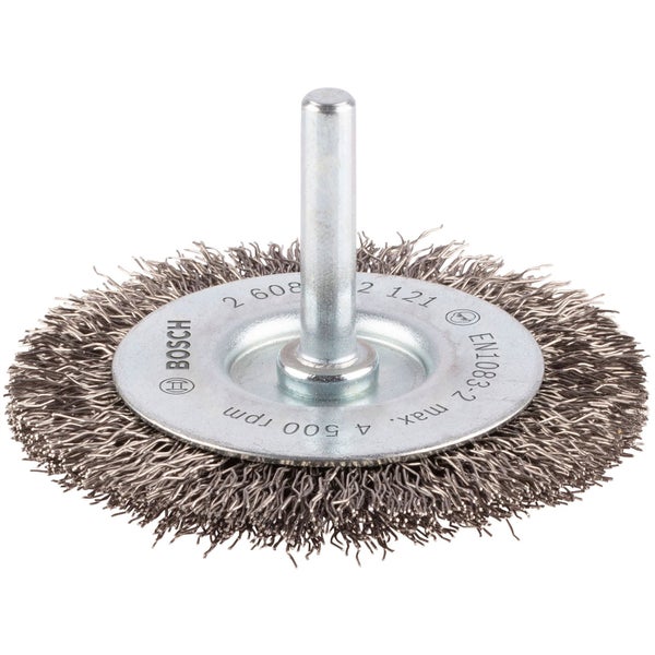 Die Scheibenbürste bietet ein gutes Feinfinish Sie ist mit gewelltem Draht für leichte bis mittelschwere Reinigungsarbeiten an kleinen Flächen ausgestattet. Ideal zum Entfernen von Anlauffarben Die Scheibenbürste ist für Reinigungsarbeiten mit hoher Drehzahl von kleineren Stahloberflächen sowie Kanten und Fugen geeignet. Darüber hinaus ist sie ideal zum Entfernen von Rost, zum Schruppen, Mattschleifen und Entfernen von Farbe geeignet. Drahtbüsten werden in verschiedenen Stärken für verschiedene Schleifgrade angeboten. Stärkerer Draht arbeitet intensiver und schafft schnell Oberflächen, die allerdings grob sind. Dünnerer Draht sorgt für feinere und glattere Oberflächen. Sie ist bestimmt für Bohrmaschinen mit Schaft 6 mm.