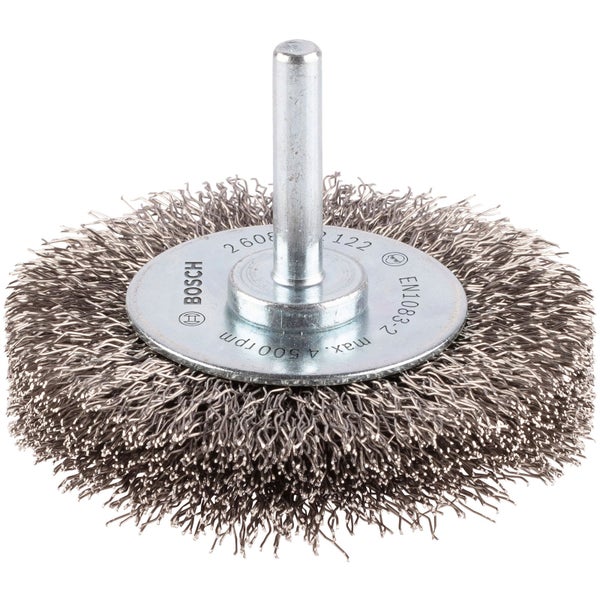Die Scheibenbürste bietet ein gutes Feinfinish Sie ist mit gewelltem Draht für leichte bis mittelschwere Reinigungsarbeiten an kleinen Flächen ausgestattet. Ideal zum Entfernen von Anlauffarben Die Scheibenbürste ist für Reinigungsarbeiten mit hoher Drehzahl von kleineren Stahloberflächen sowie Kanten und Fugen geeignet. Darüber hinaus ist sie ideal zum Entfernen von Rost, zum Schruppen, Mattschleifen und Entfernen von Farbe geeignet. Drahtbüsten werden in verschiedenen Stärken für verschiedene Schleifgrade angeboten. Stärkerer Draht arbeitet intensiver und schafft schnell Oberflächen, die allerdings grob sind. Dünnerer Draht sorgt für feinere und glattere Oberflächen. Sie ist bestimmt für Bohrmaschinen mit Schaft 6 mm.