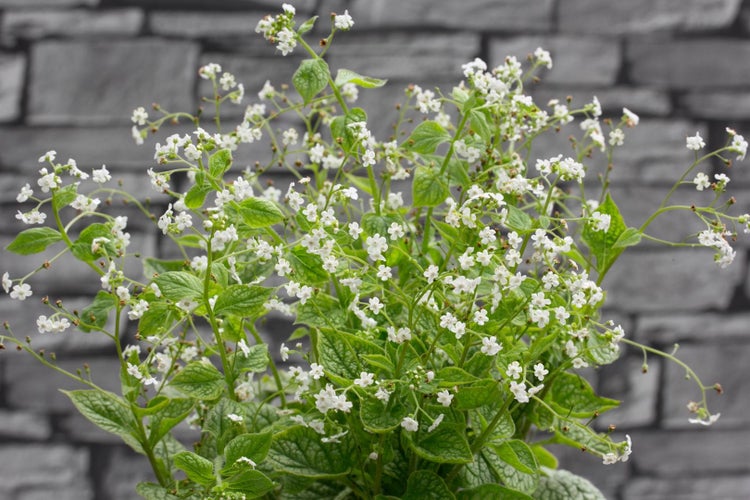 Brunnera macrophylla ‘Mr Morse’, das Kaukasus-Vergissmeinnicht, verbindet zarte Frühlingsblüte mit markantem Blattschmuck und bereichert schattige Gartenbereiche als charakterstarke Blattschmuckstaude. Die Sorte zeigt im Frühjahr reinweiße, vergissmeinnichtartige Blüten in lockeren Rispen, die über den elegant gezeichneten, herzförmigen Blättern schweben. Das Laub ist silbrig überzogen mit grünem Adernetz, bleibt bis in den Herbst attraktiv und bildet horstige, kompakte Polster. Mit einer Höhe von etwa 30 bis 45 cm und ähnlich breitem Wuchs eignet sich diese Staude ideal für das Schattenbeet, den Gehölzrand und den halbschattigen Vorgarten, setzt als Solitär im kleinen Beet Akzente und überzeugt ebenso in Gruppenpflanzungen als ruhiger, flächiger Blattschmuck. Auch als Kübelpflanze auf schattigen Terrassen oder auf dem Balkon sorgt sie für elegante Kontraste, besonders in Kombination mit Funkien, Farnen oder Helleborus.