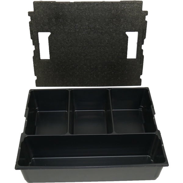 Achtung: Deckeleinlage nicht geeignet für die Bosch L-Boxx Professional 4.0! Kleinteileeinsatz aus tiefgezogenem Kunststoff mit 4 Mulden. Einteilungsmöglichkeit für die L-BOXX.