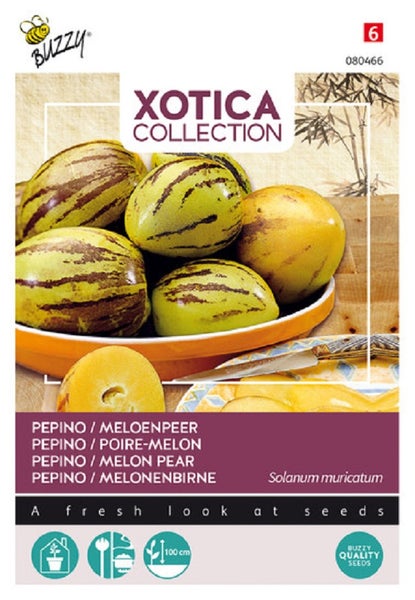 Entdecken Sie die exotische Buzzy Xotica Samen Pepino, Melonenbirne für Ihren Garten. Genießen Sie den süßen Geschmack dieser einzigartigen Frucht. Jetzt bestellen!