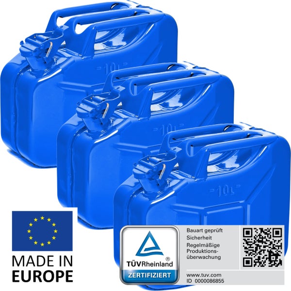 BW® Kraftstoffkanister Metall Benzinkanister 3x 10 Liter - Blau RAL 5005 - UN-Zulassung - Hergestellt in Europa