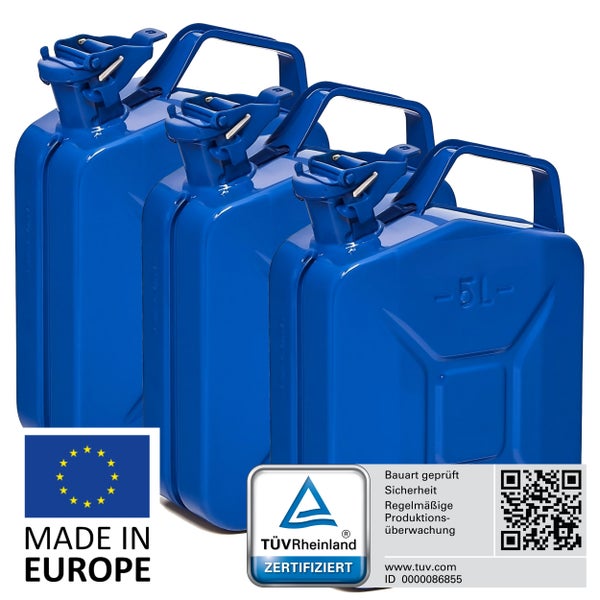 BW® Kraftstoffkanister Metall Benzinkanister 3x 5 Liter - Blau RAL 5005 - UN-Zulassung - Hergestellt in Europa