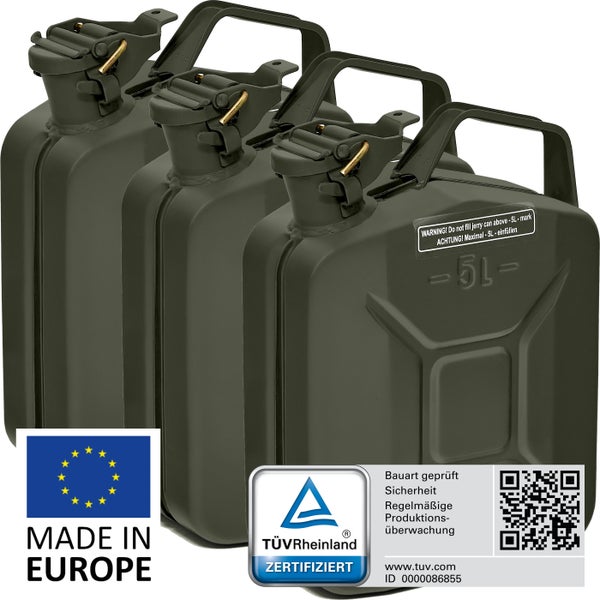 BW® Kraftstoffkanister Metall Benzinkanister 3x 5 Liter - Bronzegrün RAL 6031-F9 - UN-Zulassung - Hergestellt in Europa