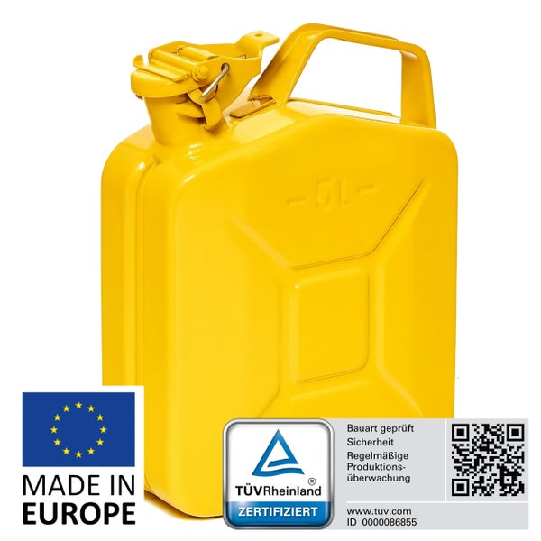 BW® Kraftstoffkanister Metall Benzinkanister 5 Liter - Gelb RAL 1018 - UN-Zulassung - Hergestellt in Europa