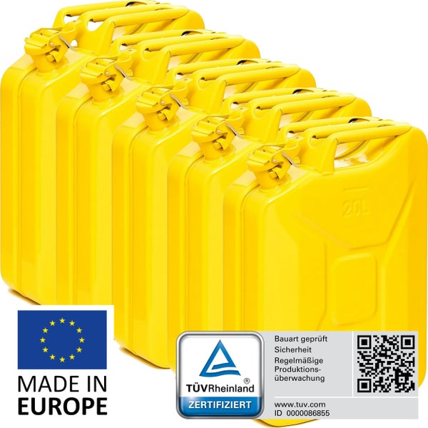 BW® Kraftstoffkanister Metall Benzinkanister 5x 20 Liter - Gelb RAL 1018 - UN-Zulassung - Hergestellt in Europa