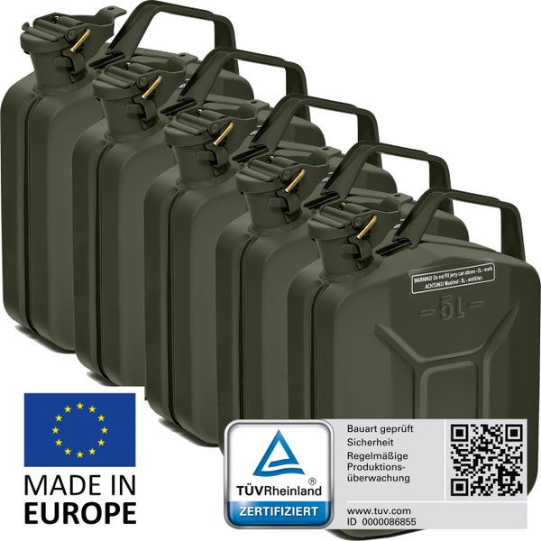 BW® Kraftstoffkanister Metall Benzinkanister 5x 5 Liter - Bronzegrün RAL 6031-F9 - UN-Zulassung - Hergestellt in Europa