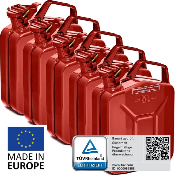 BW® Kraftstoffkanister Metall Benzinkanister 5x 5 Liter - Rot RAL 3000 - UN-Zulassung - Hergestellt in Europa
