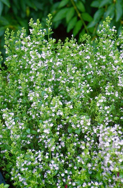 Calamintha nepeta ‘Weißer Riese’, die duftende Bergminze (auch Steinquendel genannt), ist eine elegante Gartenstaude mit außergewöhnlich reichem, schneeweißem Flor. Von Frühsommer bis in den Herbst hinein schmücken unzählige, fein schwebende Blütenrispen den buschig-horstigen Wuchs und verleihen Beeten und Rabatten eine leichte, wolkenartige Anmutung. Das frischgrüne, aromatische Laub verströmt bei Berührung eine angenehme Minznote und bildet den perfekten Kontrast zu den leuchtend weißen Blüten. ‘Weißer Riese’ zeigt sich aufrecht und reich verzweigt, erreicht je nach Standort etwa 50 bis 70 cm Höhe und bleibt dabei standfest und formschön. Als vielseitige Blütenstaude überzeugt sie im Staudenbeet, als Begleitstaude zu Rosen, in Präriepflanzungen und Steingärten ebenso wie im Kräutergarten; auch als Kübelpflanze für Terrasse oder Balkon sowie als zierlicher Solitär im Vorgarten wirkt sie attraktiv und in Gruppenpflanzung besonders harmonisch. Ideal ist ein sonniger bis leicht halbschattiger Standort mit gut durchlässigem, eher nährstoffarmem, kalkhaltigem Substrat; stauende Nässe sollte vermieden werden, während kurze Trockenphasen nach der Etablierung gut toleriert werden. Ein leichter Rückschnitt nach der ersten Hauptblüte fördert die Nachblüte und hält den Zierstrauch-Charakter der Gartenstaude kompakt, ein bodennaher Schnitt im Spätwinter sorgt für frischen Austrieb. In Kombination mit Ziergräsern, Lavendel, Salvia oder Echinacea entsteht ein naturnahes, pflegeleichtes Bild, das Beete über Monate mit feinen, weißen Blütenakzenten belebt.