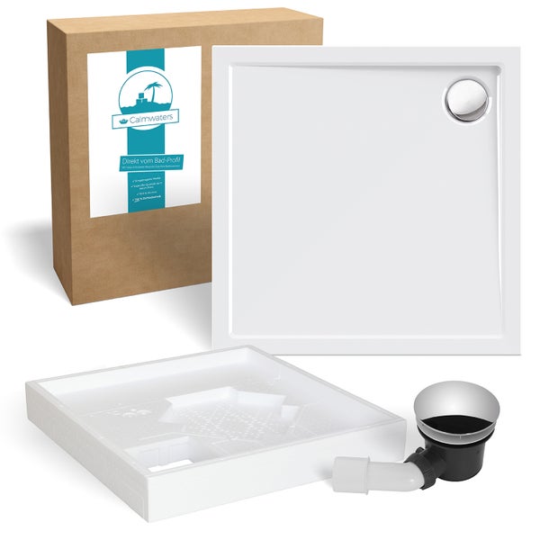 3-in-1-Set: Das Komplettset Modern Select von Calmwaters erleichtert den Einbau der Dusche um ein Vielfaches! Passend zur weißen Quadrat-Duschwanne erhalten Sie in dem Set eine Ablaufgarnitur sowie einen Wannenträger.Platzsparend: Mit den schmalen Abmessungen von 90 x 90 cm schmiegt sich die Brausetasse prima ins kleine Gäste-Bad ein, in der Ecke platziert formt ein Eckeinstieg kein Problem. Zur Montage der superflachen Dusche betten Sie das Duschbecken in den Duschwannenträger.Bodengleich: Dank des geringen Eigengewichts von 13 kg lässt sich die Brausewanne ohne Weiteres auch im Altbau nutzen. Mit einer Höhe von 2,5 cm erhalten Sie ein besonders flaches Modell, sodass der Ein- und Ausstieg mühelos gelingt.Bestes Material: Die Duschtasse besteht aus 3,2 mm starkem Acryl, was sie stabil, langlebig und pflegeleicht macht. Durch die Herstellung aus Styropor erweist sich der Träger als wärme- und schalldämmend. Die Ablaufgarnitur ist durch eine hochwertige Verchromung geschützt und glänzend in Szene gesetzt.