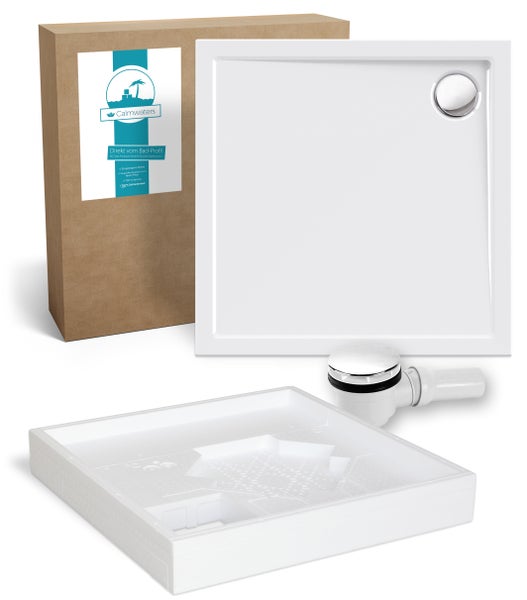 Calmwaters® Duschwannen-Set Modern Select, Flache Acryl-Brausewanne mit Wannenträger und Excenter-Ablaufgarnitur, 80 x 80 x 2,5 cm, Komplettset Acrylwanne, Bodengleicher Einbau, Weiß, 99000119