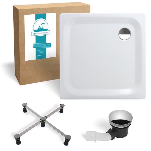 Vorteile Calmwaters Duschwannen-Set ✅ Im Set: Die ebenerdige Dusche in 90 x 90 cm kommt mit Wannenfuß und Ablaufgarnitur, mit dem Komplettset kann der Einbau bei Erhalt direkt beginnen. ✅ Bodengleicher Einbau: Mit 2,5 cm eignet sich die Duschwanne als bodengleiche Dusche. Der Duschablauf leitet das Wasser sicher in den Abfluss. ✅ Zeitloser Look: Mit der quadratischen Form schmiegt sich die flache Brausewanne elegant ins Bad. Die weiße Farbe harmoniert gut mit jeder Gestaltung. ✅ Stabiler Stahl: Die Duschtasse besteht aus robuster Stahlemaille, so widersteht sie dem täglichen Gebrauch mühelos. Mit 26,4 kg für Altbau geeignet. ✅ 100 % Service & Zuverlässigkeit ➨ Dieser Artikel genügt den höchsten Qualitätsansprüchen. Bei Rückfragen hilft Ihnen unser Kundenservice gerne weiter. Produktdetails Duschwannen-Set Calmwaters: Sicherheit beim Badezimmer-Kauf Mit Calmwaters erfüllt sich Ihr persönlicher Traum vom Bad. Der geprüfte Badshop bietet Ihnen eine breite Auswahl an hochwertigen Markenartikeln zu fairen Preisen - von der Badewanne, über das Stand-WC bis zum Waschbecken. Die schnelle Lieferung der Produkte für Bad und Küche erfolgt in stabilen Kartonagen. Vertrauen Sie auf Calmwaters für eine zuverlässige Badezimmer-Planung! Ebenerdige Brausetasse Essential Soft im Komplettset in 90 x 90 cm aus Stahl-Email Das Komplettpaket Essential Soft von Calmwaters besteht aus einem niedrigem Duschbecken, einem Wannenfuß und einer Ablaufgarnitur. Die kleine Maße der bodengleichen Dusche eignen sich für schmale Badezimmer oder Gäste-WCs. In der Ecke platziert ist ein Eckeinstieg problemlos umsetzbar. Für eine hohe Haltbarkeit sorgt das verwendete Material der Brausetasse: Stahlemaille. Für die Montage montieren Sie den Wannenfuß an der Unterseite des Duschbeckens und setzen die Ablaufgarnitur ein. Eigenschaften Duschwanne