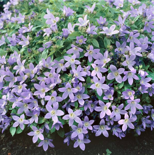 Campanula lactiflora ‘Pouffe’, die Milchglockenblume, ist eine kompakte Blütenstaude, die mit elegantem, locker aufrechtem bis rundbuschigem Wuchs jeden Ziergarten bereichert. Ihre zahlreichen, zart glockenförmigen Blüten in sanftem Lavendelblau bis Hellblau erscheinen von Juni bis August in dichten Rispen und schweben über frischgrünem, lanzettlichem Laub, das den ganzen Sommer für eine gepflegte Optik sorgt. Als niedrigere, polsterartige Variante der Art bleibt ‘Pouffe’ angenehm kompakt und eignet sich ideal für den Vordergrund im Staudenbeet, für die Rabatte, den Bauerngarten und den Vorgarten. Ebenso überzeugt sie als Kübelpflanze auf Terrasse oder Balkon und lässt sich als zierliche Schnittblume dekorativ in Vasen nutzen. Diese Gartenstaude bevorzugt einen sonnigen bis halbschattigen Standort auf humosem, nährstoffreichem, gut durchlässigem und gleichmäßig frischem Boden; kurzfristige Trockenheit wird toleriert, Staunässe sollte vermieden werden. Eine dünne Mulchschicht hält die Feuchtigkeit im Wurzelbereich, während eine leichte Frühjahrsdüngung das Blütenreichtum fördert. Ein Rückschnitt nach der ersten Hauptblüte regt eine Nachblüte an und erhält die kompakte Form, zudem bleibt der Horst dauerhaft vital und standfest. In Gruppenpflanzung setzt der Blütenstrauch-Effekt der Milchglockenblume weiche, romantische Akzente, als Solitär im kleinen Beet wirkt ‘Pouffe’ ebenso überzeugend. Harmonische Partner sind filigrane Gräser, zarte Rosen und andere Sommerstauden, die ihre luftige Erscheinung betonen. Robust und winterhart bringt Campanula lactiflora ‘Pouffe’ zuverlässige Farbigkeit und Leichtigkeit in jeden Gartenstrauch- und Staudenbereich.