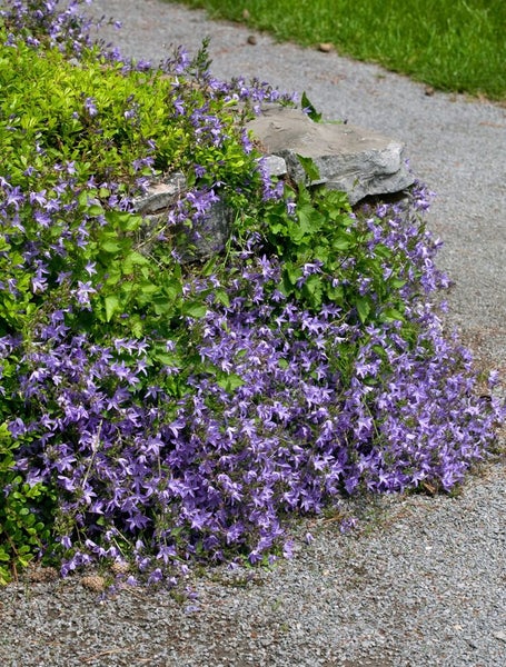 Campanula poscharskyana ‘Templiner Teppich’, die serbische Polster-Glockenblume, ist eine robuste, lange blühende Staude, die mit unzähligen sternförmigen, lavendelblauen bis violettblauen Blüten begeistert. Von Frühsommer bis in den Herbst hinein überzieht sie Beetränder, Steingärten und Mauerkronen mit einem dichten Blütenteppich, während das frische, herzförmig gezähnte Laub ganzjährig ansehnlich bleibt und je nach Winter mildegrün bis halbimmergrün wirkt. Der flach kriechende, teppichbildende Wuchs mit elegant überhängenden Trieben macht sie zum idealen Bodendecker und zur vielseitigen Polsterstaude für den Vorgarten, als Beetrandpflanze, zur Flächenbegrünung in Gruppenpflanzung oder als Solitär-Akzent in Töpfen und Balkonkästen, wo sie lässig über den Rand fällt und dekorative Kaskaden bildet.