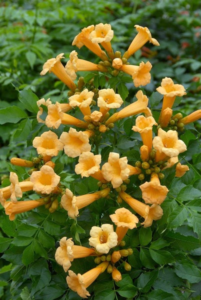 Campsis radicans ‘Golden Trumpet’, die Trompetenblume beziehungsweise Klettertrompete, bringt mediterranes Flair in den Garten und überzeugt mit leuchtend goldgelben, trompetenförmigen Blüten. Das robuste Klettergehölz zeigt von Juli bis September eine üppige Blüte, die sich in sonnenwarmen Lagen besonders reich entwickelt. Das gefiederte, frischgrüne Laub bildet einen wirkungsvollen Kontrast und färbt sich im Herbst dekorativ. Als kräftige Rankpflanze wächst die Amerikanische Trompetenblume mit Haftwurzeln an Rankgittern, Pergolen, Rosenbögen und Hauswänden empor und eignet sich hervorragend für die Fassadenbegrünung, als Solitär am Spalier oder zur Begrünung von Sichtschutz- und Zaunelementen. Auch im großen Kübel auf Terrasse oder Innenhof entfaltet dieser Zierkletterer seine Wirkung, wenn eine stabile Kletterhilfe bereitsteht.