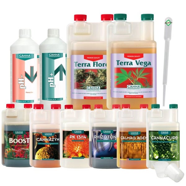 Canna Dünger Set 10-teilig – Komplettes Nährstoffprogramm für kräftiges Wachstum & üppige Blüten – Inkl. Terra Vega, Terra Flores, Boost, PK 13/14, Rhizotonic, Calmag, pH-Plus/Minus