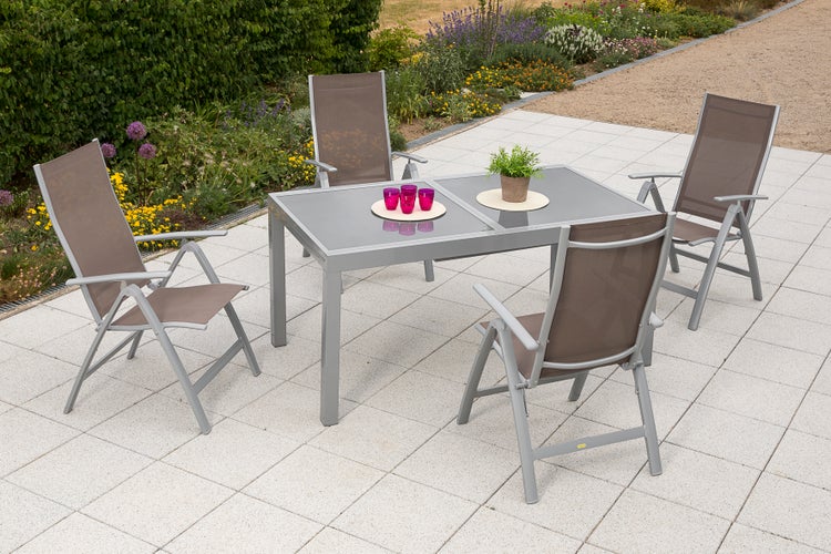 Das 5tlg. Gartenmöbelset Carrara -Moderne Serie für Garten, Balkon und Terrasse.Für Ihren Garten oder Ihre Terrasse ist das Gartenmöbelset Carrara die perfekte Eränzung.Besonders die Klappsessel des Sets lassen sich individuell anpassen und bieten eine optimale Entspannung. Mit fünf verschiedenen Rückenverstellungen können Sie Ihre Sitzposition nach Belieben einstellen. Die ergonomisch geformte Sitz- und Rückenfläche sorgt darüber hinaus für einen hohen Sitzkomfort.Ein weiteres Highlight an den Sesseln ist das breitem Aluminiumprofil, die dem Gartensessel ein edles Aussehen verleihen. Abgerundet wird das Set durch einen Ausziehtisch mit einer grauen Glasplatte. Mit einem Grundmaß von 160 x 90 cm bietet der Tisch ausreichend Platz für gemütliche Mahlzeiten im Freien. Bei Bedarf kann er auf eine Länge von 220 cm ausgezogen werden, um noch mehr Gäste unterzubringen.Das Gartenmöbelset Carrara besteht aus einem pulverbeschichteten Aluminiumgestell.Die Sessel sind mit einem Textilbezug bespannt, der für zusätzlichen Komfort sorgt. Die Tischplatte besteht aus 5 mm dickem Sicherheitsglas, das für Stabilität und Sicherheit beim Benutzen des Tisches sorgt.