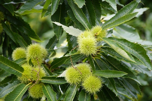 Castanea sativa: Die Edelkastanie (Marone) ist ein majestätischer Baum, der köstliche Esskastanien produziert. Sie ist ideal für größere Gärten und bietet im Herbst eine schöne Laubfärbung. Von Juni bis Juli schmückt sich die Pflanze mit grünlich weißen Blüten, die einen starken Duft abgeben.