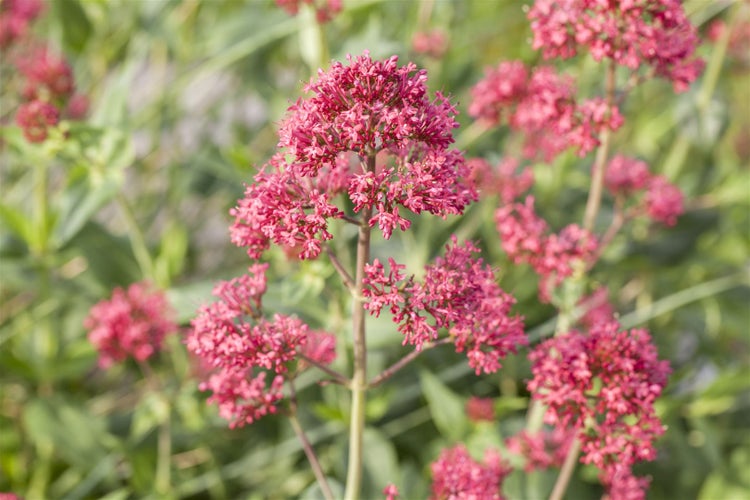 Centranthus ruber ‘Coccineus’, die Rote Spornblume, ist eine bewährte, mehrjährige Gartenstaude mit mediterranem Flair, die durch ihre leuchtend scharlachroten bis karminroten Blütenrispen vom späten Frühjahr bis in den Herbst beeindruckt. Die reich verzweigten, aufrechten Triebe bilden einen lockeren, rundlichen Horst, der je nach Standort etwa 60 bis 90 cm Höhe erreicht. Das blaugrüne bis graugrüne, fleischige Laub steht gegenständig und betont die luftigen, duftenden Blütenstände, die dem Beet eine leichte, schwebende Struktur verleihen. Als Zierstaude macht sie im sonnigen Staudenbeet, im Steingarten, an Trockenmauern und in Mauerfugen ebenso eine gute Figur wie im Vorgarten; als Solitärstaude setzt sie lebhafte Farbakzente, in der Gruppenpflanzung sorgt sie für rhythmische Wiederholung. Auch in größeren Gefäßen ist sie als pflegeleichte Kübelpflanze geeignet.