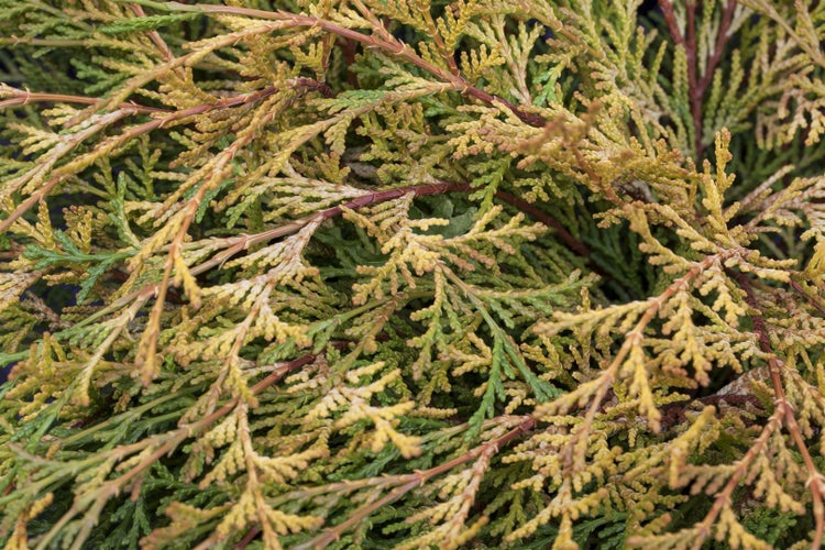 Das Laub bleibt über den Winter überwiegend goldgrün, bei kühlem Licht mit feiner Bronze-Nuance, und wirkt durch seine dichte Textur besonders gepflegt. ‘Kamarachiba’ bevorzugt einen sonnigen bis halbschattigen Standort; in voller Sonne leuchtet die Goldfärbung am intensivsten, während leichter Schatten die Nadeln vor Verbrennungen schützt. Der Boden sollte gleichmäßig frisch, humos und gut durchlässig sein, gern leicht sauer bis schwach neutral; Staunässe ist zu vermeiden. Eine lockere Mulchschicht hält die Feuchtigkeit, und moderate, regelmäßige Wassergaben fördern einen kompakten Aufbau. Schnitt ist kaum nötig, allenfalls ein behutsames Auslichten ohne ins alte Holz zu schneiden. Als pflegeleichtes Ziergehölz eignet sich die Hinoki-Zypresse für Grabbepflanzungen, Steinbeete, Rabattenkanten und kleine Heckenabschnitte niedriger Höhe, wo ein ruhiger, formstabiler Gartencharakter gewünscht ist. In dekorativen Gefäßen kommt die fein strukturierte, duftende Belaubung besonders zur Geltung und unterstreicht moderne wie japanisch inspirierte Gestaltungen.