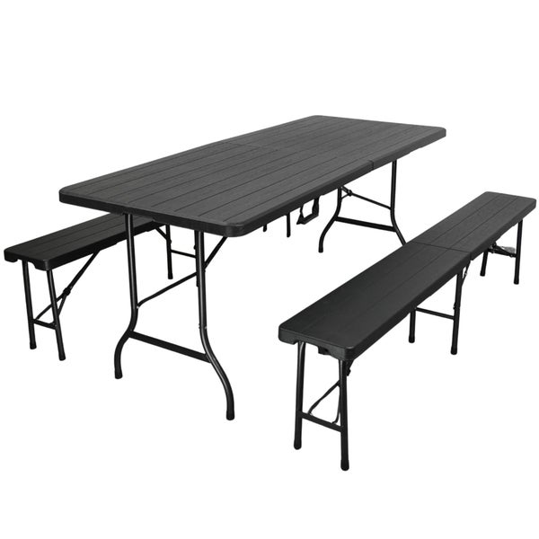 Das Stahlgestell aus robustem Metall sorgt bei Tisch und Bänken für hervorragende Stabilität und Langlebigkeit. Dank der wetterfesten Konstruktion ist das Set sowohl für den Innen- als auch Außenbereich geeignet – perfekt für Garten, Terrasse, Balkon, Camping oder Eventeinsätze. Die hochwertigen Kunststoffoberflächen in stilvoller Holz Optik (Schwarz) überzeugt durch ihr elegantes Design und ist zudem pflegeleicht und einfach zu reinigen.