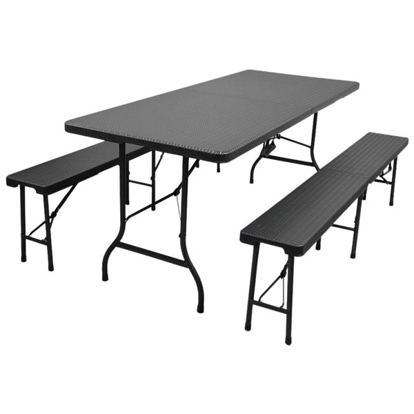 Das Stahlgestell aus robustem Metall sorgt bei Tisch und Bänken für hervorragende Stabilität und Langlebigkeit. Dank der wetterfesten Konstruktion ist das Set sowohl für den Innen- als auch Außenbereich geeignet – perfekt für Garten, Terrasse, Balkon, Camping oder Eventeinsätze. Die hochwertigen Kunststoffoberflächen in stilvoller Rattan-Optik (Schwarz) überzeugt durch ihr elegantes Design und ist zudem pflegeleicht und einfach zu reinigen.