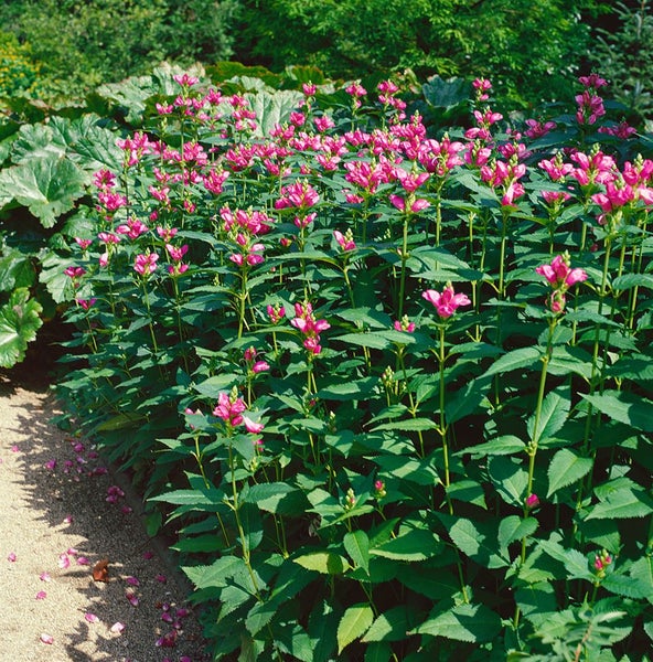 Chelone obliqua, der Schiefblättrige Schild-Ehrenpreis, ist eine elegante, horstig wachsende Blütenstaude mit aufrechter, buschiger Erscheinung und sattgrünem, gegenständigem Laub. Von Spätsommer bis in den Herbst öffnet dieser robuste Gartenklassiker seine markanten, schildkrötenkopfartigen Blüten in kräftigem Rosa bis Purpurrosa, die dicht an stabilen Stielen sitzen und dem Beet einen klaren, strukturierten Akzent verleihen. Mit einer Höhe von etwa 60 bis 80 cm und einer kompakten Breite eignet sich die Staude hervorragend für den Mittelgrund von Rabatten, naturnahe Pflanzungen und den Teich- oder Gehölzrand, wo frische bis feuchte, humose und nährstoffreiche Böden gegeben sind. In sonnigen bis halbschattigen Lagen zeigt der Schild-Ehrenpreis seine Farben besonders leuchtend, solange der Boden gleichmäßig feucht bleibt und Staunässe vermieden wird. Als Blütenstaude im Staudenbeet, in Gruppenpflanzung oder als zurückhaltender Solitär setzt Chelone obliqua verlässliche Spätsommerakzente; in ausreichend großen Gefäßen lässt sie sich auch als Kübelpflanze auf Terrasse und im Vorgarten kultivieren, wenn eine kontinuierliche Wasserversorgung sichergestellt ist. Ein leichter Rückschnitt abgeblühter Stiele fördert einen aufgeräumten Eindruck, während eine Mulchschicht die Bodenfeuchte stabil hält. Eine Startdüngung im Frühjahr und gelegentliches Nachdüngen in der Hauptsaison unterstützen den vitalen Wuchs. In Kombination mit Funkien, Astilben, Herbstastern oder Farnen entstehen harmonische, standortgerechte Arrangements, die Struktur und Farbe zuverlässig verbinden und dem Garten bis weit in den Herbst hinein eine klare, hochwertige Wirkung geben.