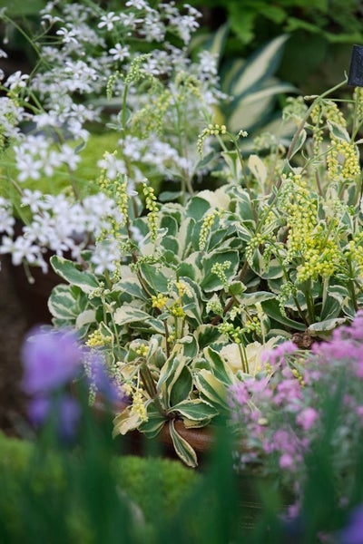 Chiastophyllum oppositifolium ‘Jim’s Pride’, das Goldtröpfchen, ist eine aparte Polsterstaude mit sukkulent anmutendem, immergrünem bis wintergrünem Laub und elegant überhängenden Blütenständen. Die Sorte ‘Jim’s Pride’ überzeugt durch zweifarbiges, frischgrünes Blattwerk mit cremefarbenen Rändern, das kompakte Rosetten bildet und ganzjährig Struktur in Beete und Steingärten bringt. Im späten Frühling bis in den Frühsommer entwickeln sich zahlreiche, bogig herabhängende Rispen aus kleinen, goldgelben Sternblüten, die wie feine Trauben über dem dichten Blattschopf schweben und dem Blütenstaudengarten eine leuchtende Note verleihen. Mit einer Wuchshöhe von etwa 15–25 cm, in Blüte etwas höher, und moderater Breite eignet sich dieses Goldtröpfchen hervorragend als Vordergrundpflanze im Staudenbeet, als strukturstarke Steingartenstaude, für den Alpin- oder Trog-Garten sowie als langlebige Kübelpflanze auf Terrasse und Balkon. Im Halbschatten bis lichten Schatten entfaltet der Blüten- und Blattschmuck seine beste Wirkung, besonders an geschützten Standorten wie dem Gehölzrand, wo der Blütenstrauch-Charakter kleiner Ziergehölze stimmig ergänzt wird. Ein gleichmäßig frischer, humoser, gut drainierter Boden ist ideal; Staunässe sollte vermieden werden, während kurze Trockenphasen nach Etablierung gut toleriert werden. Ein leichter Rückschnitt verblühter Rispen fördert die Vitalität, gelegentliches Teilen älterer Polster erhält die kompakte Wuchsform. In Gruppenpflanzung erzeugt die Staude ruhige, geschlossene Flächen, als Solitär setzt sie im Vorgarten dezente, edle Akzente und harmoniert mit Schattenstauden wie Farnen, Hosta und Purpurglöckchen.