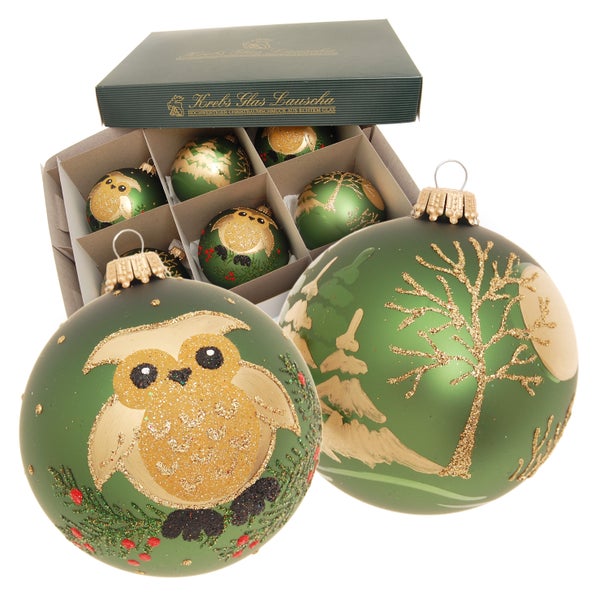 Christmas Glaskugel-Set Eule & Wald (Weihnachtswald), Moosgrün Satin 6-teilig, 8cm, 6 Stck., Weihnachtsbaumkugeln, Christbaumschmuck, Weihnachtsbaumanhänger