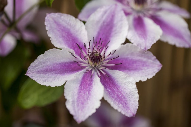 Clematis Hybride 'Carnaby', Waldrebe, zweifarbig rosa-weiß, 60–100 cm