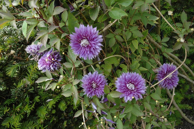 Clematis Hybride ‘Josephine’, die prachtvolle Waldrebe mit botanischem Namen Clematis, überzeugt als edle Kletterpflanze mit außergewöhnlichen, gefüllten Blüten in zartem Rosa bis Flieder, deren grünlich roséfarbener Mittelkranz wie eine Rosette wirkt. Von Mai/Juni bis in den Spätsommer hinein zeigt dieser Blühkletterer eine reiche Nachblüte, wobei die ersten Blüten oft üppig gefüllt und spätere Blüten halbgefüllt bis einfach erscheinen. Das frischgrüne, sommergrüne Laub bildet einen attraktiven Kontrast und unterstreicht die elegante, aufrechte und rankende Wuchsform, die an geeigneter Rankhilfe – ob Zaun, Pergola, Rosenbogen, Spalier oder Obelisk – etwa 2 bis 3 Meter Höhe erreicht. Als dekorative Rankpflanze setzt ‘Josephine’ Akzente im Vorgarten, im Staudenbeet als vertikaler Blickfang, in Kombination mit Rosen oder als Solitär am Eingangsbereich und eignet sich hervorragend als Kübelpflanze auf Terrasse und Balkon, sofern eine stabile Kletterhilfe vorhanden ist. Ein sonniger bis halbschattiger Standort mit kühlem, beschattetem Wurzelbereich ist ideal; der Boden sollte humos, nährstoffreich, locker und gleichmäßig feucht sein, aber Staunässe vermeiden. Eine Mulchschicht oder flachwurzelnde Begleitstauden halten die Wurzeln angenehm kühl. Leichte Schnittmaßnahmen nach der ersten Blüte fördern die Nachblüte, und ein zurückhaltender Formschnitt im späten Winter entspricht der Pflege einer großblütigen Clematis der Schnittgruppe 2. Regelmäßige, aber maßvolle Düngergaben im Frühjahr unterstützen die Blühfreude und sorgen dafür, dass diese edle Schlingpflanze Jahr für Jahr mit spektakulärer Farbe und üppiger Blütenfülle begeistert.